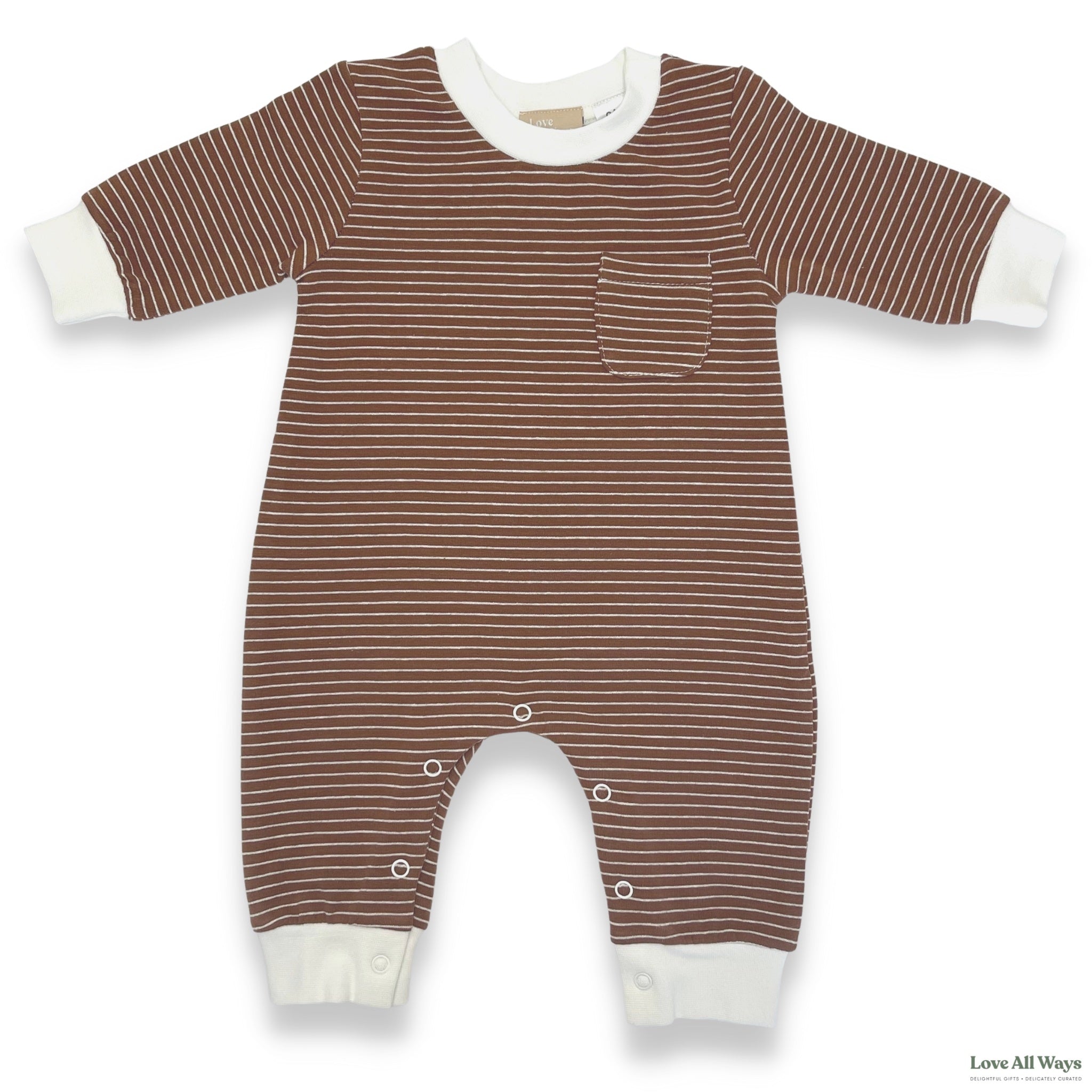 Orders take 1-2 Business days to be sent out.In fashion there are only a few mainstays and must haves in a wardrobe! This Organic Cotton yarn dyed french terry romper is one of those. It uses the iconic Pin Stripe in colours Vintage Brown and White to celebrate this classic look. With a slightly oversized fit and stripe detailing it is sure to attract attention. The GOTS certified Mini French Terry Organic Cotton used in these rompers has a soft, warm texture recognisable from your comfiest tracksuit or softest feeling loungewear. Mixed with the cotton is 5% Spandex which has amazing stretch capabilities and assists with seamless over head changes. The white trim and cuffs creates visually appealing contrasts, is super soft on baby's skin and is an everyday, comfy look product. The details are: