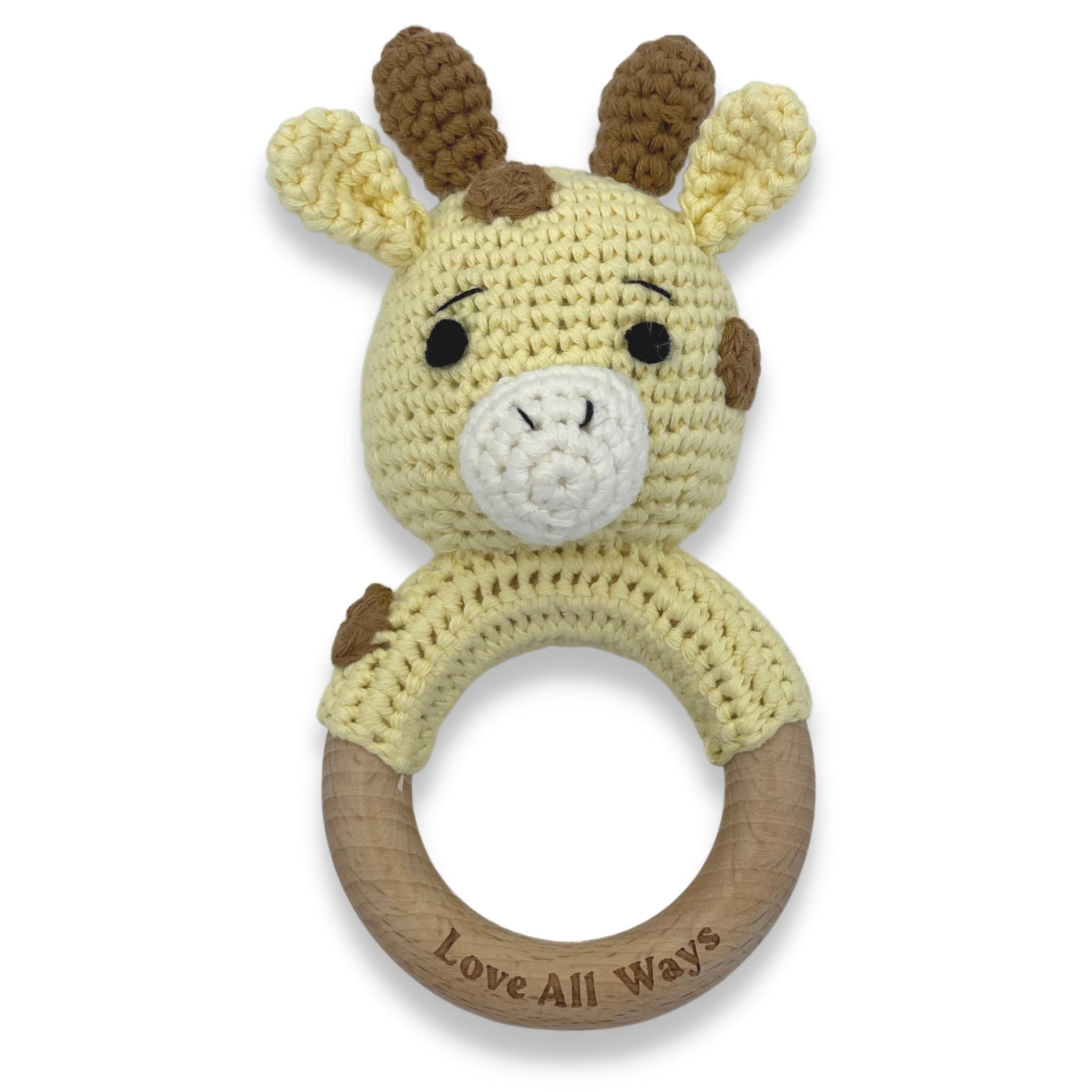 The beechwood teether, with a 7cm diameter, is perfectly sized for tiny hands. Which is naturally antibacterial. It features a Giraffe-shaped exterior made from 100% cotton, complete with an internal rattle. The hand-crocheted finish adds a touch of classic elegance, ensuring a safe experience for your baby. Please note that the fabric is suitable for handwashing only.