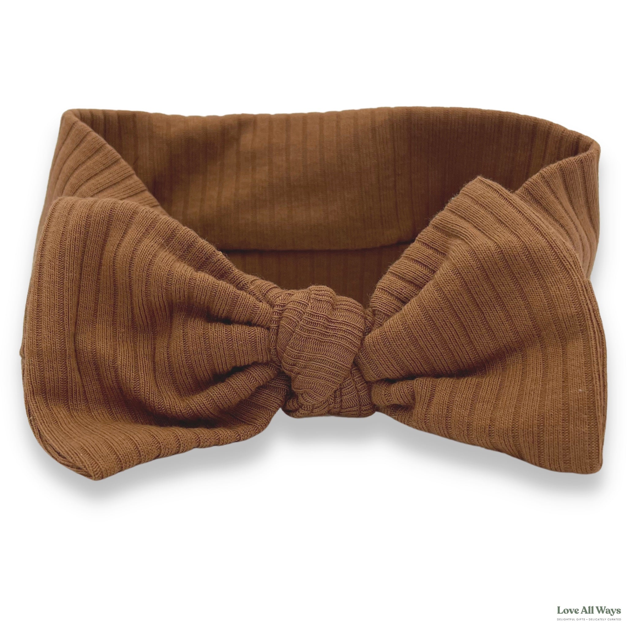 Our ribbed knit headbands are gentle, calming and natural. The breathable organic cotton design has subtle ribbed detailing and offers a super soft to the touch feel. The bow measures approximately 11 cm wide and 7 cm high. The headband is designed for 0 - 3 months