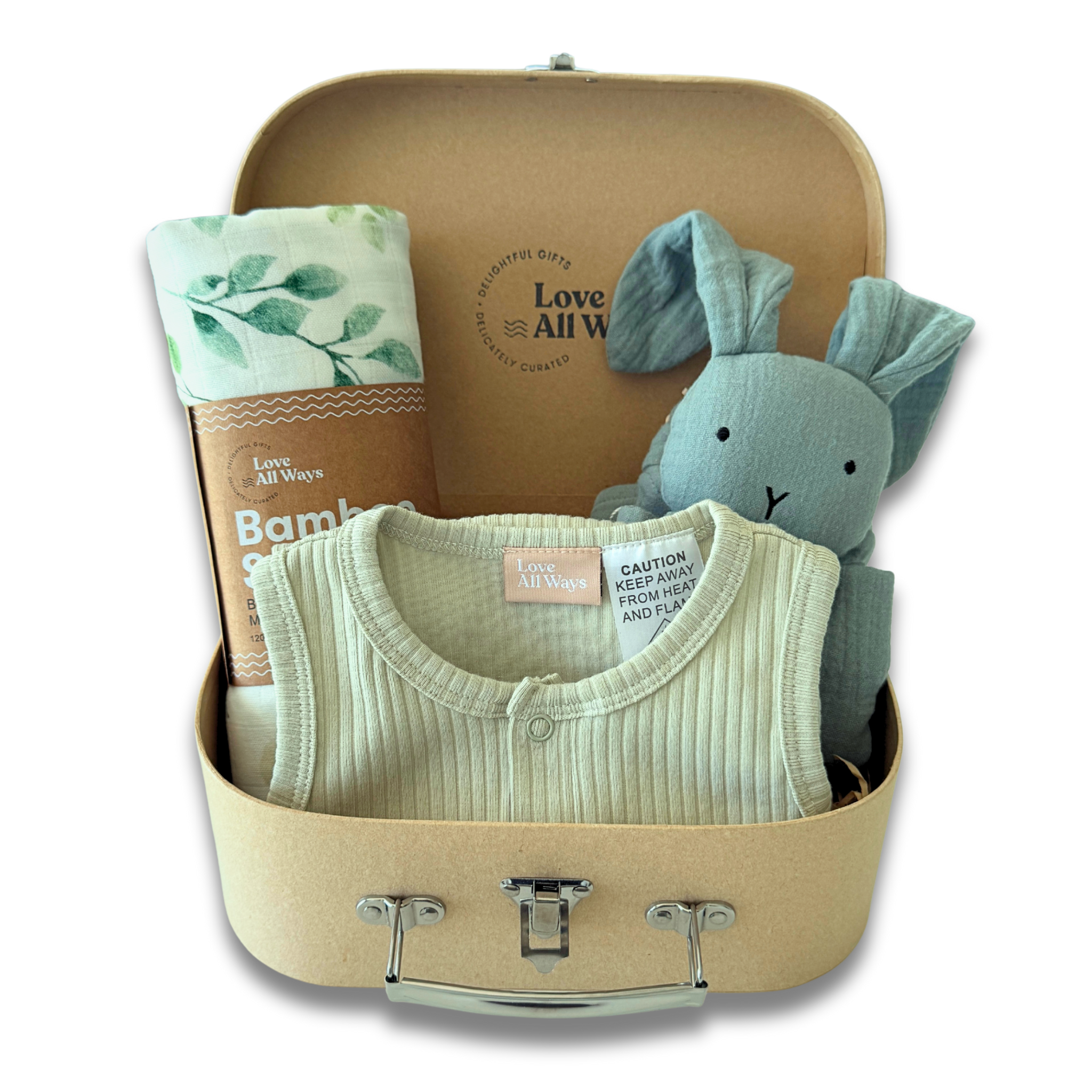 Welcome baby in comfort and style thanks to our Summer Bunny Classic Baby Hamper. This hamper brings together a set of gentle, nature-inspired baby essentials — all crafted with soft, breathable materials — perfect as a newborn gift, baby shower present, or thoughtful “welcome home” box. The soft hues and nature-inspired tones make this hamper a versatile, gender-neutral choice that fits beautifully in any nursery.